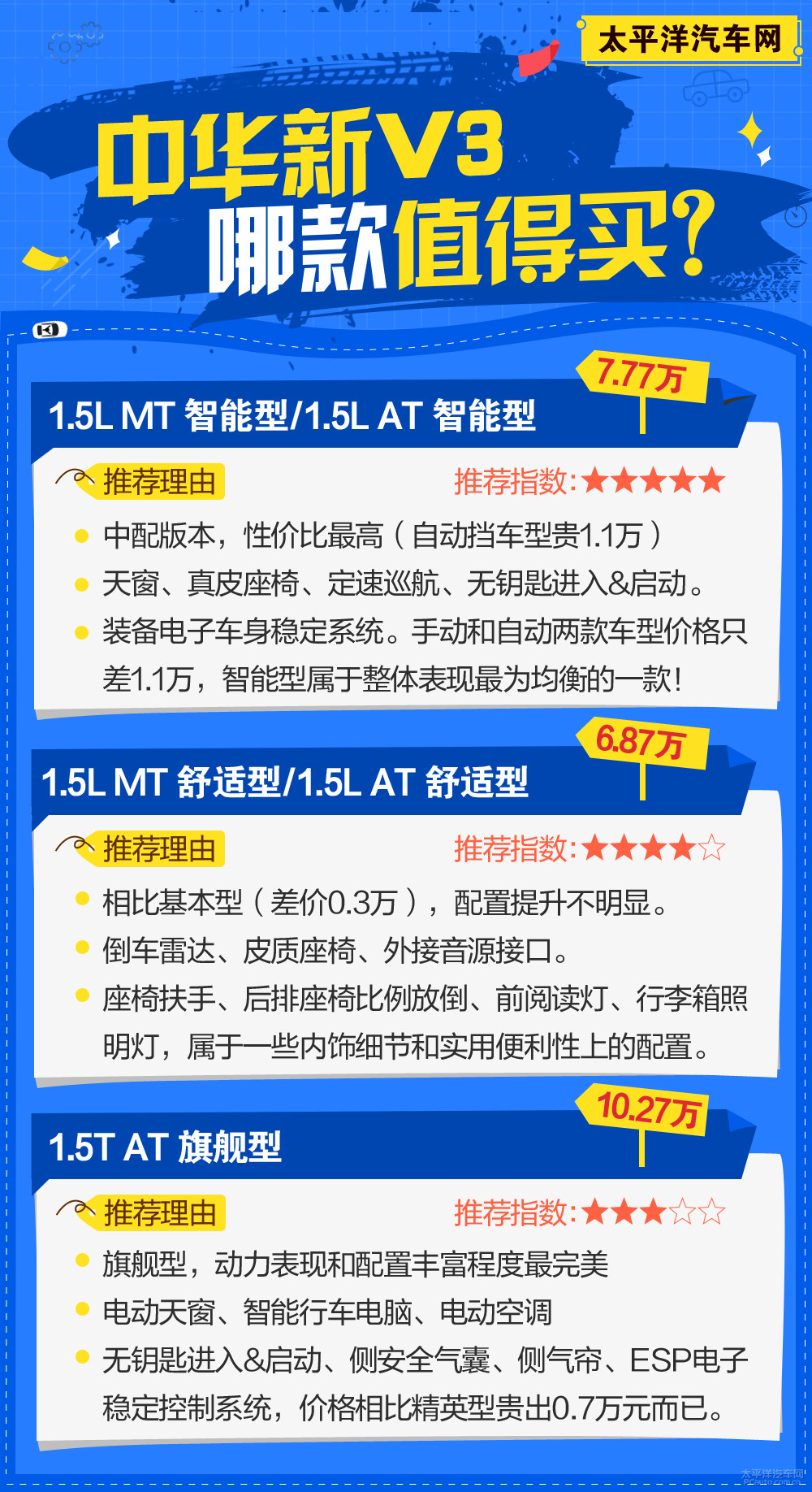最新款华晨中华V3配置1.5L/1.5T2款柴油发动机,而传动装置则配搭5档手动式或5档手自一体变速器。依据驱动力与配备的不一样,区划为1.5L MT 标准型/舒适/精锐型/全智能、1.5L AT 舒适/精锐型/全智能、1.5T MT/AT精锐型/旗舰型共11款车系,市场价区段为6.57-10.27万余元。