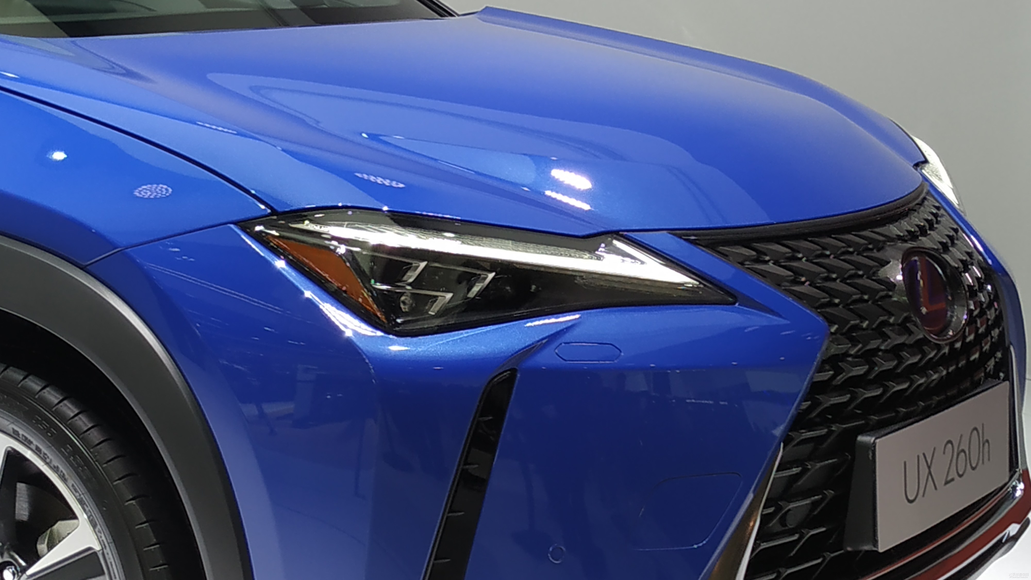 凌志雷克萨斯UX260h与汽柴油版车系的差别均在每处的关键点以突显,前脸的纺锤形前脸从网状结构变为了点阵式设计方案,而非对称加密式棱形头灯组內部也作出了一丝修改。而正下方的粗大不锈钢饰条、深蓝色的雷克萨斯车标具有了画龙点晴的功效。