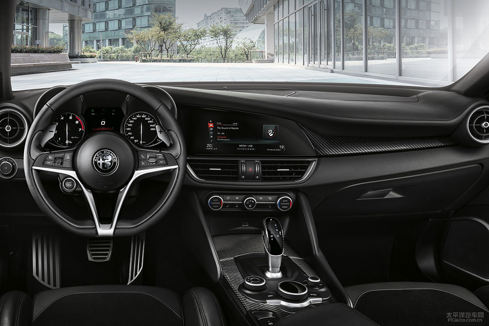 埃尔法·罗密欧Giulia Veloce Ti以内装一部分进一步出示了复合材料仪表台装饰板和灰黑色牛皮+Alcantara 双拼别墅坐椅(前座带8向电动式调整和座椅加热,后排座适用4/2/4占比放平)、带灰黑色缝合线的牛皮中控台和铝合金型材换挡拨片等配备。