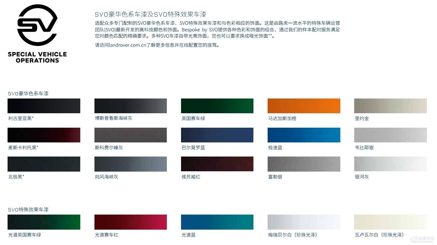 车体色调上,新汽车将出示单色漆、珠光漆及其奢华珠光漆共12种色可选择,除此之外,新汽车可以根据SVO精英团队订制专享的车漆色调。另外新汽车可以挑选与车体同色系汽车后备箱或挑选拼色汽车后备箱。轮毂层面新汽车也出示了10多种配搭计划方案。