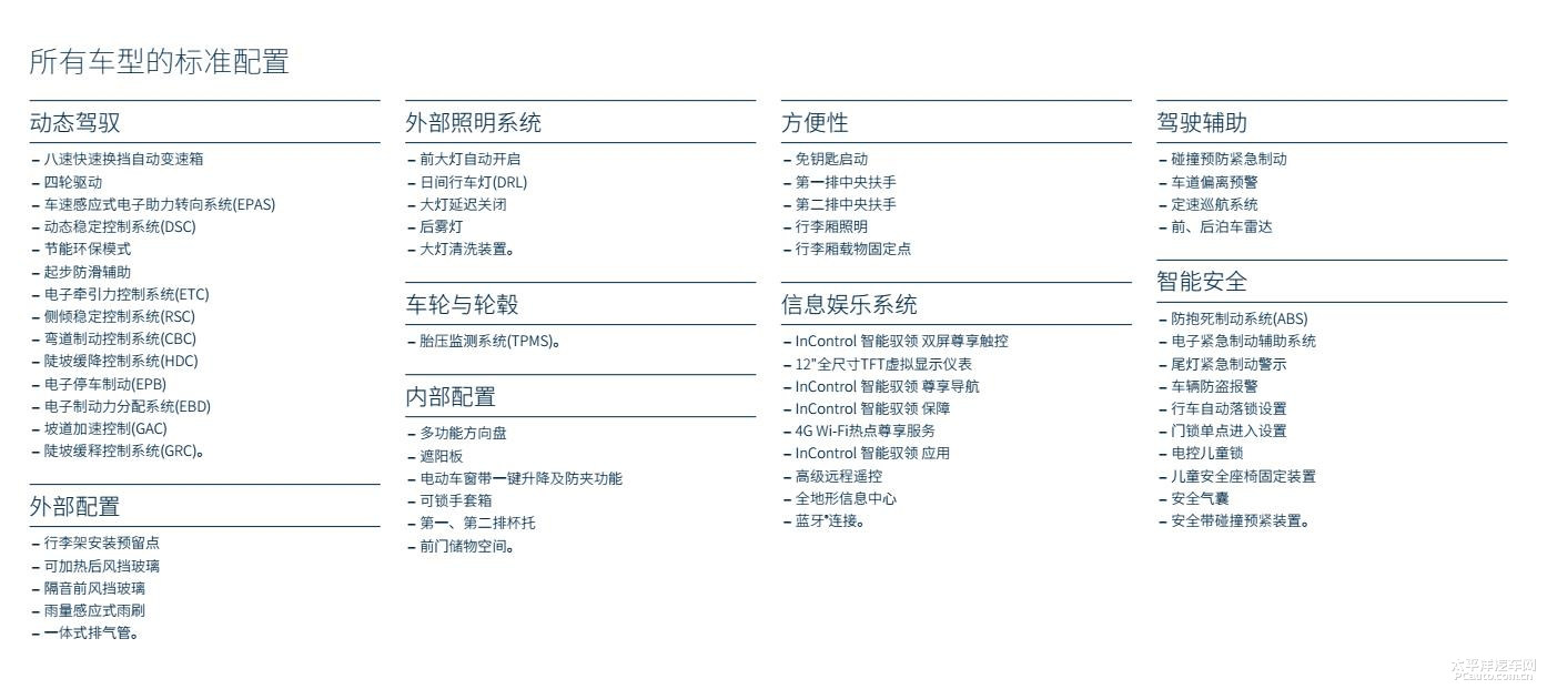 配备层面,新汽车将标准配置四轮驱动、动态性平稳操纵、侧倾平稳操纵、陡坡缓降操纵、自动大灯、LED日行灯、胎压监测、真皮运动方向盘、无钥匙启动、中控台双屏幕车载多媒体、12英尺全液晶仪表盘、撞击防止紧急停车、行车道偏移预警信息、定速巡航系统等。