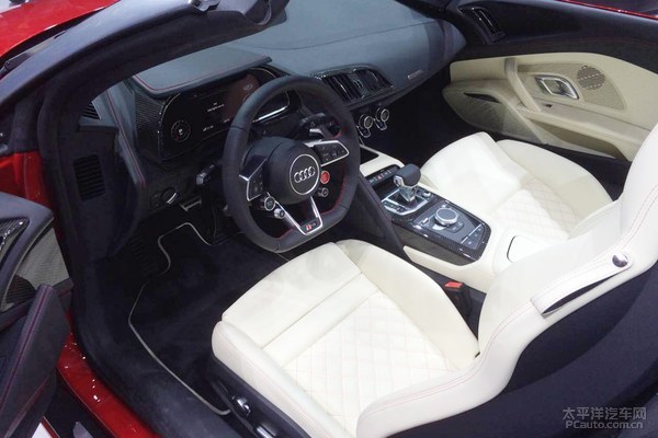驾驶舱内,全新升级R8 V10 Spyder将中控台显示屏挪到车内仪表盘上,12.3英尺TFT液晶显示屏车内仪表盘就替代原先的中控台显示屏。中控台地区仅剩了实体线功能键和旋纽。全新升级的汽车方向盘也别具一格,并集成化柴油发动机一键启动按键。