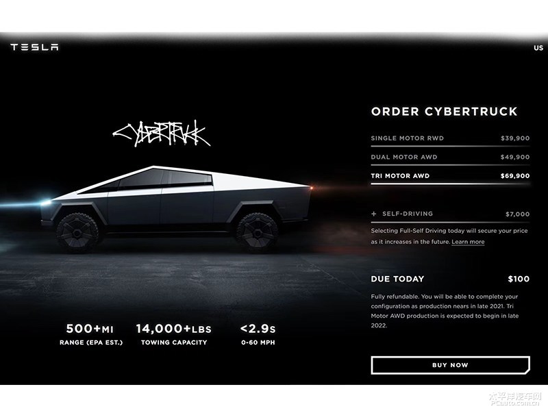 依照特斯拉汽车美国官网的信息内容,客户现阶段预订Cybertruck只需付款100美金(折合RMB704元)预付款,而且可以足额退钱,这也许都是Cybertruck得到较多订单信息的缘故之一,终究针对网民而言,花那么低的成本费装放一发,也是可以的。除此之外,现阶段汉语订购页面也已对外开放,三个版本号车系订购价均为1000元RMB,也可足额退钱。