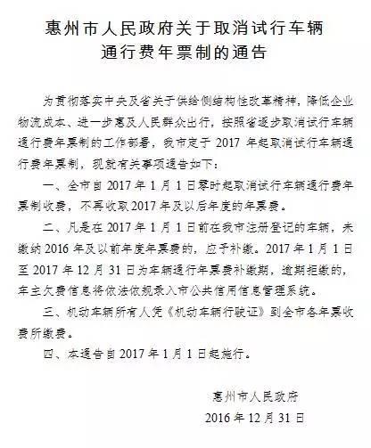 而在惠州政府所公布的通知里也对于开展了确立地回应:在2017年1月1此前在我区登记注册的车子,未交纳2016年及之前年度年卡费的,也需开展补交。