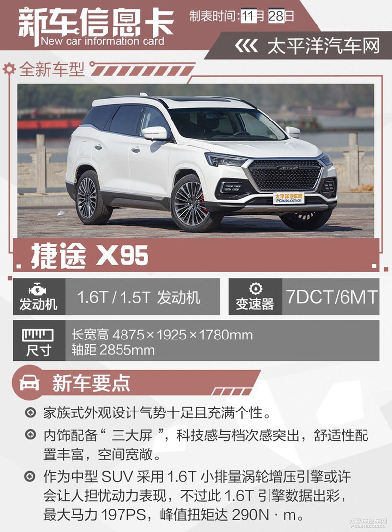 捷途X95精准定位中小型SUV,尺寸各自为4875/1925/1780mm,轮距做到2855mm,规格比传祺GS8、比亚迪唐等敌人要大一点,代表捷途X95非常充足的车里室内空间。