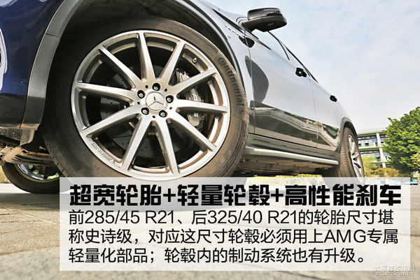 规格做到前285/45 R21、后325/40 R21的车胎确保了车重2.5吨、大马力557PS的GLE63自始至终有着充裕的耐磨性,并且胎壁算不上过薄,时常挑戰一下Offroad也不必担忧车胎会非常容易损伤。而造型设计苗条却不缺抗压强度的轻量AMG专享轮圈则让此“大脚”也不会导致簧下载重量的飙涨。值得一提的是,轮圈内的制动系统也换掉了AMG专享的性能构件。