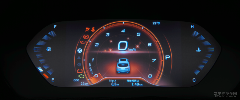 新汽车装有10英尺中控触摸屏和全液晶显示屏智能化车内仪表盘,车内仪表盘页面清楚最易读,可显示信息均值时速、瞬间耗油量、续驶、轮胎气压信息内容、车窗外溫度等。