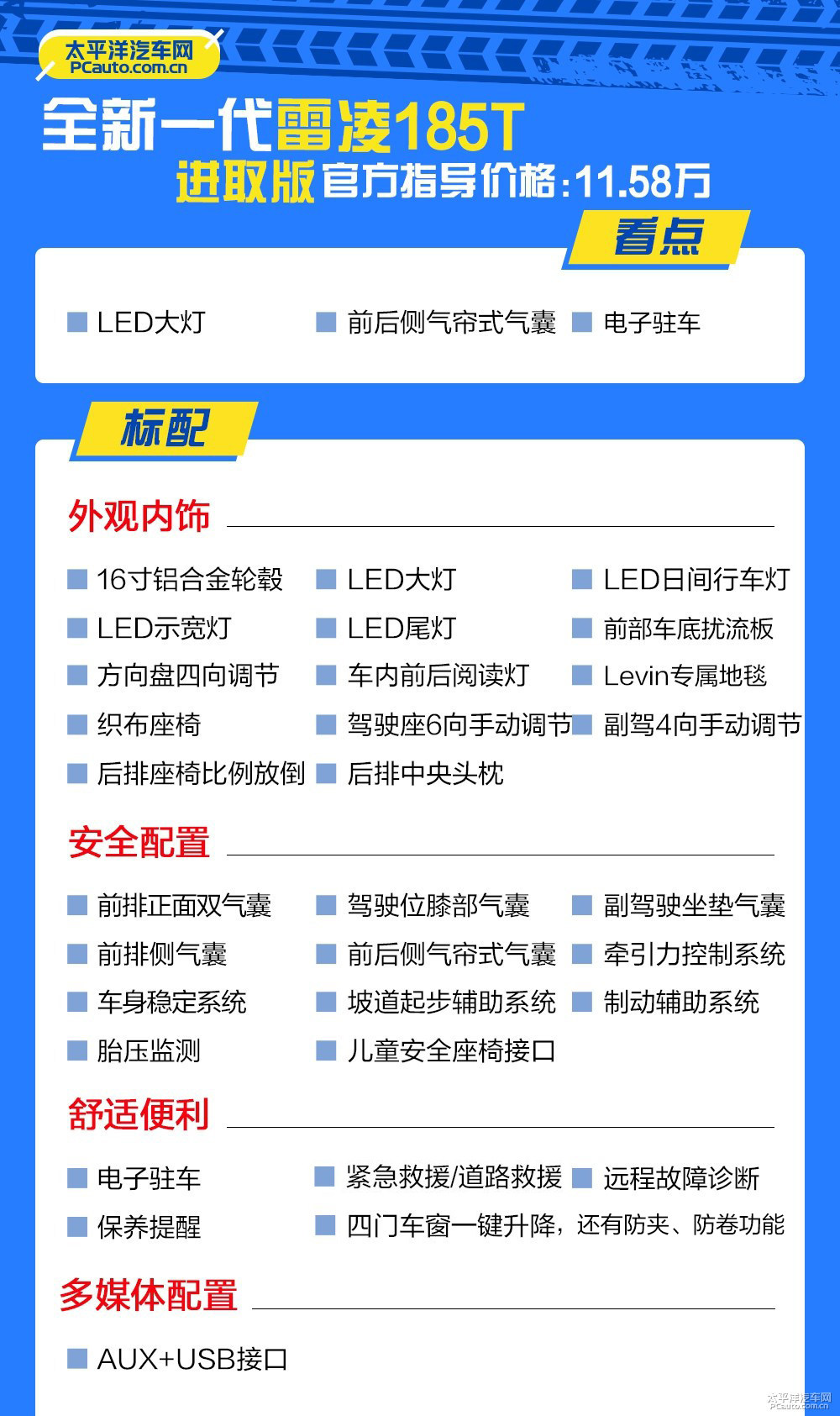 新一代雷凌的基本配备很高,总体构思和C-HR、凯美瑞的构思十分类似,最能体现丰田汽车低龄化、潮流化和特色化的线路,以往真实实际意义上的乞讨者版早已已不活在TNGA构架下的商品里边。就算是最少配的雷凌185T奋发进取版和双擎奋发进取版,其有闪光点的配备也比大众速腾和本田思域多不少,分毫不“乞讨者”。