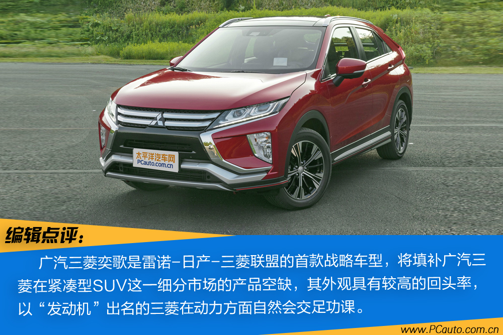 广汽三菱主打产品全新升级紧凑SUV——奕歌是三菱“Eclipse Cross”的国内版本号,前脸选用三菱全新“Dynamic Shield”设计语言,造型设计十分低龄化,两根类似“C”型的不锈钢饰条围绕车灯轮廊并拓宽至保险杆下边,相互配合尖锐的的车大灯组和规格极大的前雾灯,具有了一定的視覺撞击力。