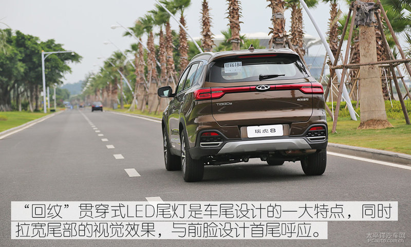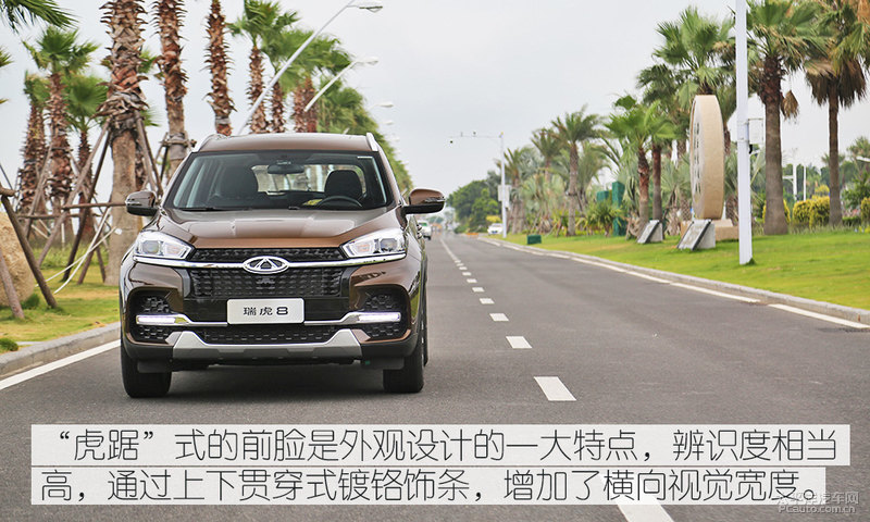 外型:虎踞式前脸 辨识度高做为全新升级的旗舰级车系,设计方案上瑞虎8选用的是奇瑞汽车全新的家族化设计方案,例如“虎踞”式的进气格栅及其“回纹”围绕式后尾灯,辨识度都非常高,显著差别于主打产品别的SUV车系,拥有旗舰级需有的韵味。