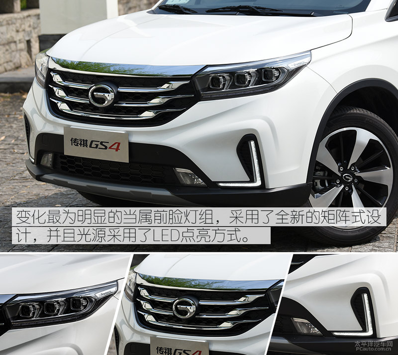 最新款传祺GS4在外型上的升級不言而喻,更合乎现代都市年青人的审美观核心理念,而转变更为显著的当属车灯组与LED日行灯了。