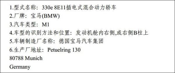 宝马330e通电式混合动力车型已在2015赫尔辛基汽车展公布,此车的中国申报信息已曝出,有希望在2017年進口。此外,由于现阶段的5系的插电式混动版——530Le早已在中国发售,因而330e国产基础没多少伏笔。