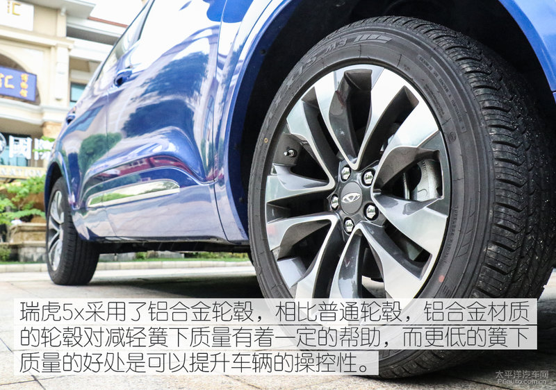 瑞虎5x选用了铝合金轮毂,对比一般轮圈,铝合金型材材料的轮圈对缓解簧下品质拥有 一定的协助,而更低的簧下品质的益处是能够 提高车子的安全性能。