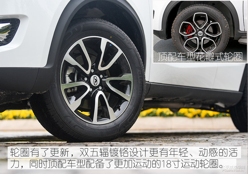 轮毂在新款汽车上也拥有升级,由原先的银白色好几条辐式轮毂换以便更为炫酷的不锈钢材料五辐轮毂,另外高配车系配置了更为有运动感的花朵式五辐轮毂加鲜红色刹车盘设计方案,更受年青人钟爱。从轮毂规格上试驾车型为215/60 R17,顶配车系为215/55 R18。自然顾客还可以依据要求自身选配。