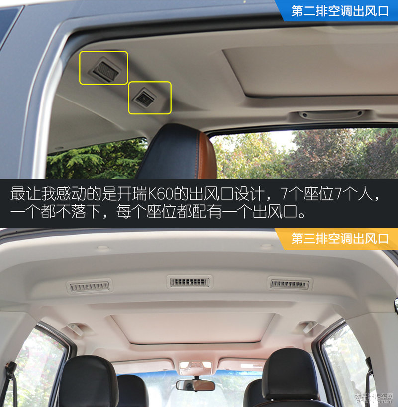 因为这车室内空间十分大,假如只能前座通风口,后排座是彻底体会不上冷气的,夏季的情况下坐后排座跟洗桑拿没什么差别了,因此开瑞十分暖心地为每名旅客提前准备一个通风口,并且后排座可独立调整排风量。