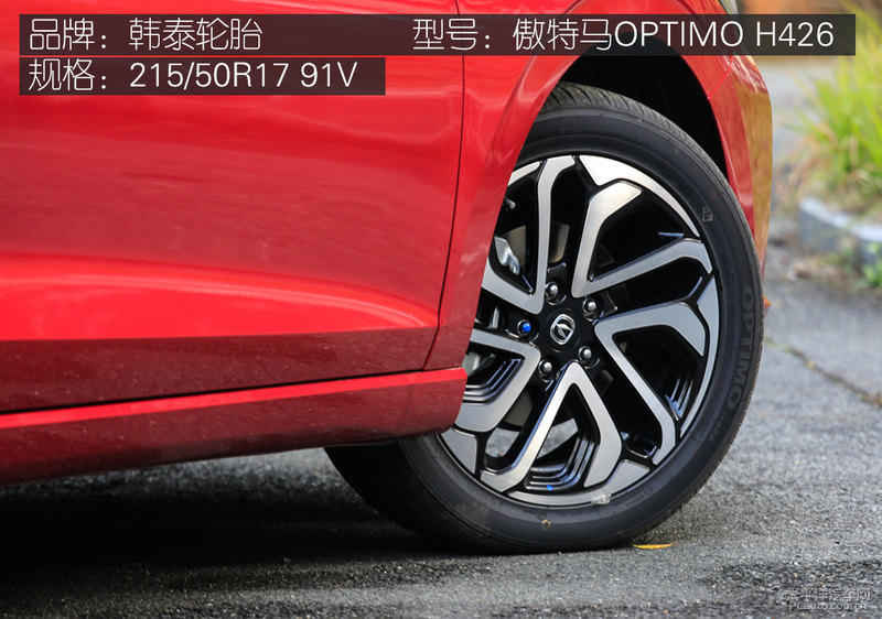 第二代逸动试驾车配上炫酷十足的两色双五幅轮圈,车胎为韩泰知名品牌的傲特马型号规格,规格型号为215/50R17 91V,这款四季胎趋向舒服,被很多生产商认同应用,而标配车系则会配备16英寸的轮毂。