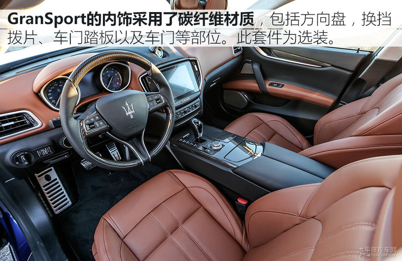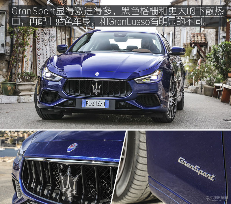 GranSport版本号看起来激进派得多,灰黑色亮漆的格珊和更大的下热管散热口,另配上蓝色的车身,和GranLusso也有显著的不一样。GranSport运动版还出示了一套可选配的车体复合材料模块。这组模块包含复合材料车门把手、倒车镜机壳、B柱和C柱后盖板、前侧气体分流器和后侧尾翼。人们此次的试驾车并沒有选配。