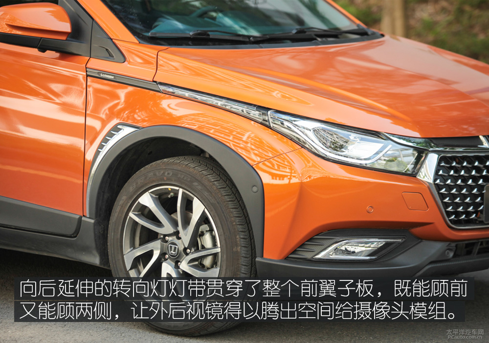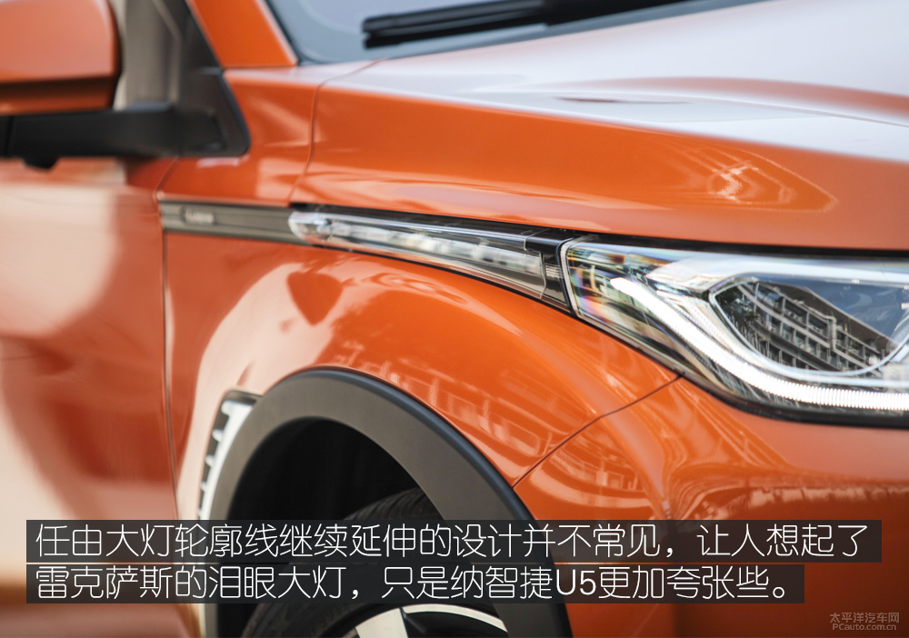 反面看车灯并无独到之处,但略微偏点视角角度就能注意到其独到之处,向后拓宽并围绕前翼子板的条形方向灯是纳智捷U5的一大识别点,官方网起名叫魅眼车灯,那样的车灯设计并不普遍,非常容易令人想到凌志雷克萨斯的眼泪车灯,可是比后面一种,纳智捷U5的车灯线框更为张杨、浮夸。