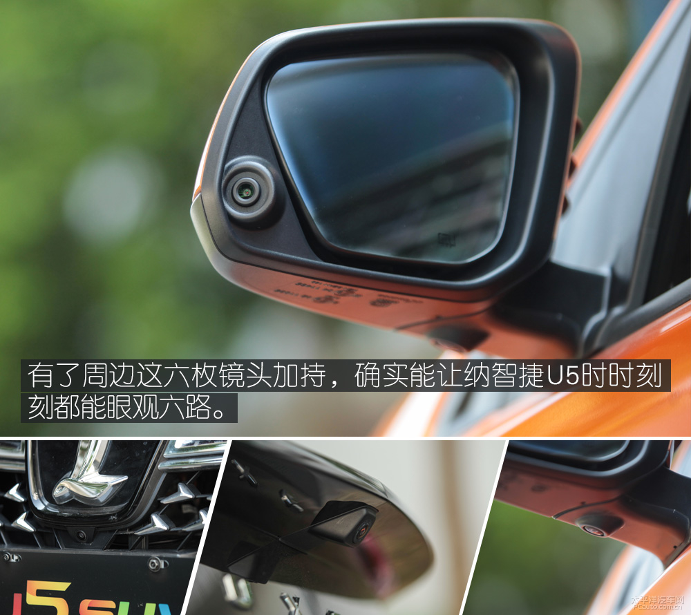 纳智捷U5就是说那类从外型就能感受到其较新科技配备的车系,这一点要从外置摄像头谈起,围住车走一圈,非常容易就能发觉遍布在车前、外倒车镜及其后尾的六枚监控摄像头。