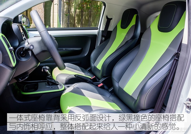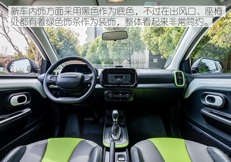 车内饰层面,新汽车以胶襄原素为主题风格,选用灰黑色做为背景色,但在通风口、坐椅处都拥有翠绿色饰条做为装饰设计,总体看上去十分简洁。而中控屏则看上去有点儿时代气息,不把弄一下还以为是传统式车截CD机。车内饰材料层面算作个闪光点,毛毯与顶篷选用了 PVC洁净环境保护材料。
