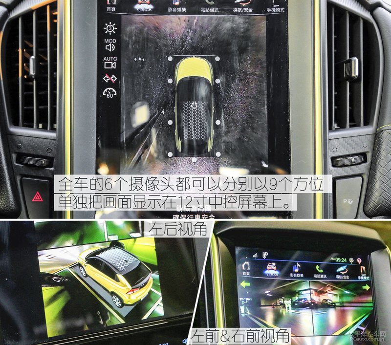 最先整车的六个监控摄像头都能够各自以9个方向独立把界面显示信息在12寸中控台显示屏上。除开基本了上下两边之外,还包含正前方两边、左后/右后、正后方。