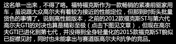 纵横江湖十二载的福克斯ST,一不留神就在第一个循环时把一副柴油机模块塞入盔甲,这让夙敌高尔夫球一夜之间多了GTD的蛮横霸道竞争对手一枚!下学能先不要走吗?来看恶斗是必定的,输赢由谁操控却不一定,谁叫这德美双雄几乎都硬本事在身不能容忍一丝娇情呢。