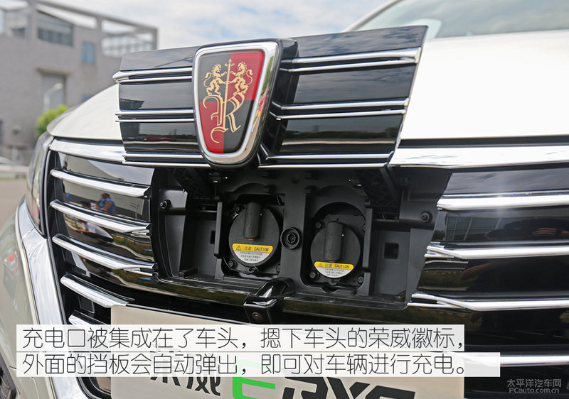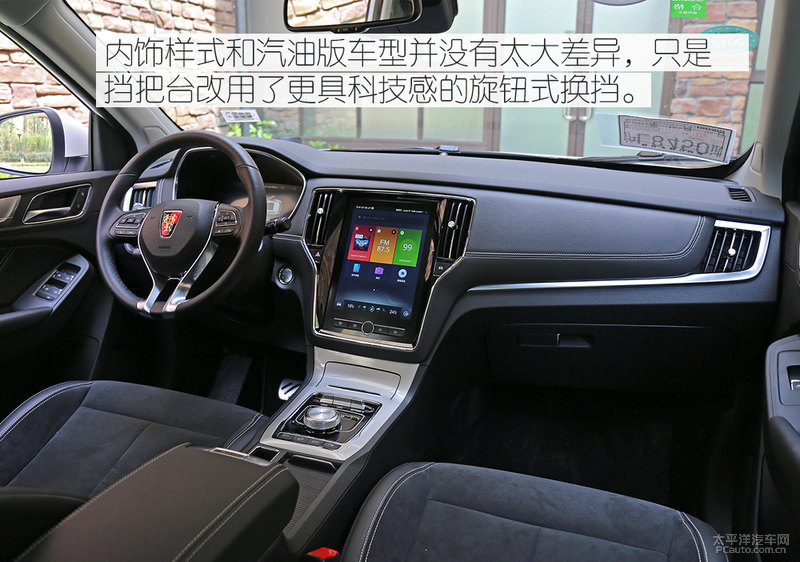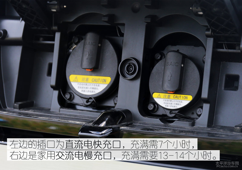 除开前杠,一些关键点上的差别还可以辨别出纯电动车版车系。例如后尾取消了排汽管,车身贴到了纯电动车版的专享logo,车体两边没了给油口和充电口,快速充电和慢充2个插孔都掩藏在了车前前杠的汽车标志后边。有趣的是,电池充电时荣威汽车的LOGO还会继续充做电池充电显示灯而照亮。