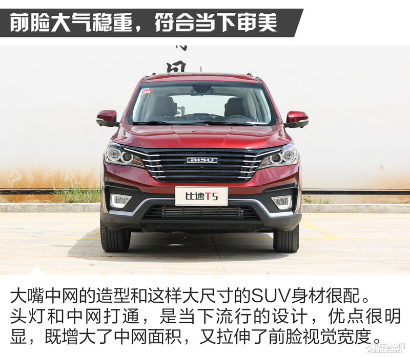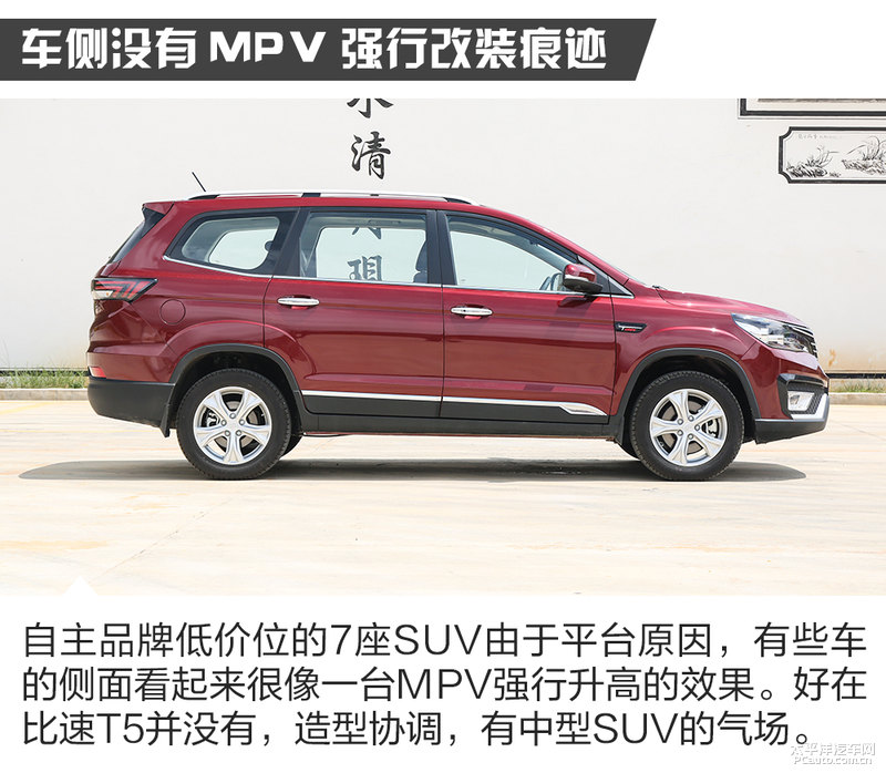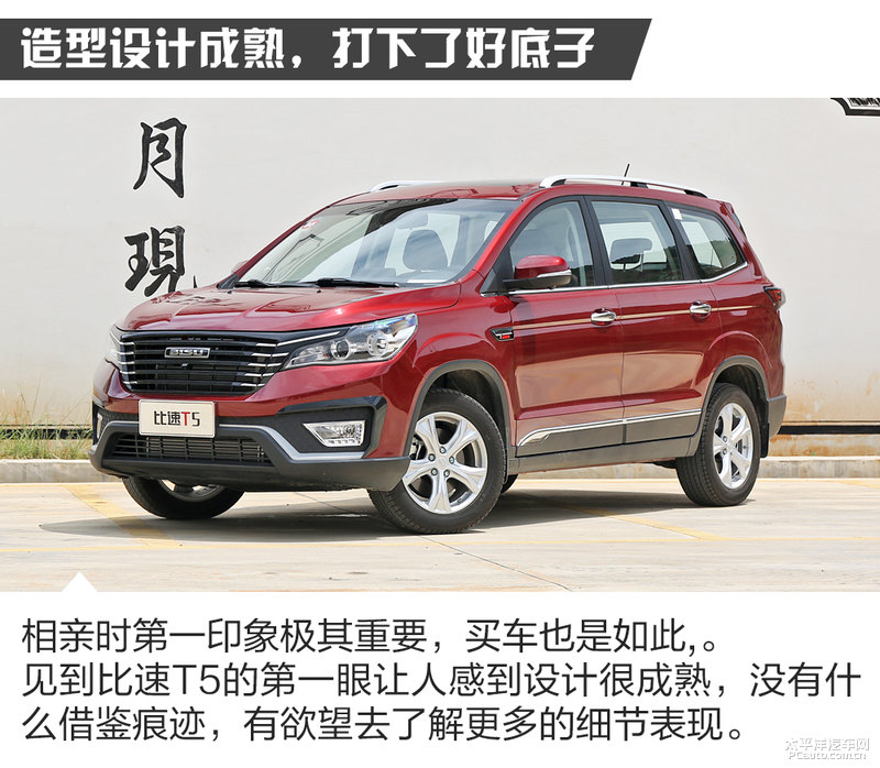 比速T5的造型设计最先是原創的、完善的,第一眼就能感受到的那类工业产品设计之美。关键点上,粗大的进风口和多横幅的不锈钢格珊,造型设计注重的头后尾灯线框,都传送出针对精美感的追求完美。全车轮廊上并不会像一些同档次SUV那般,有显著的由MPV强制改动成SUV的违和。比速T5身型尽管纤长,但总体還是融洽均匀的。车体钣金件也干了许多曲线和横切面造型设计,从设计方案审美观和钣金工艺2个方面而言,都称之为认真。