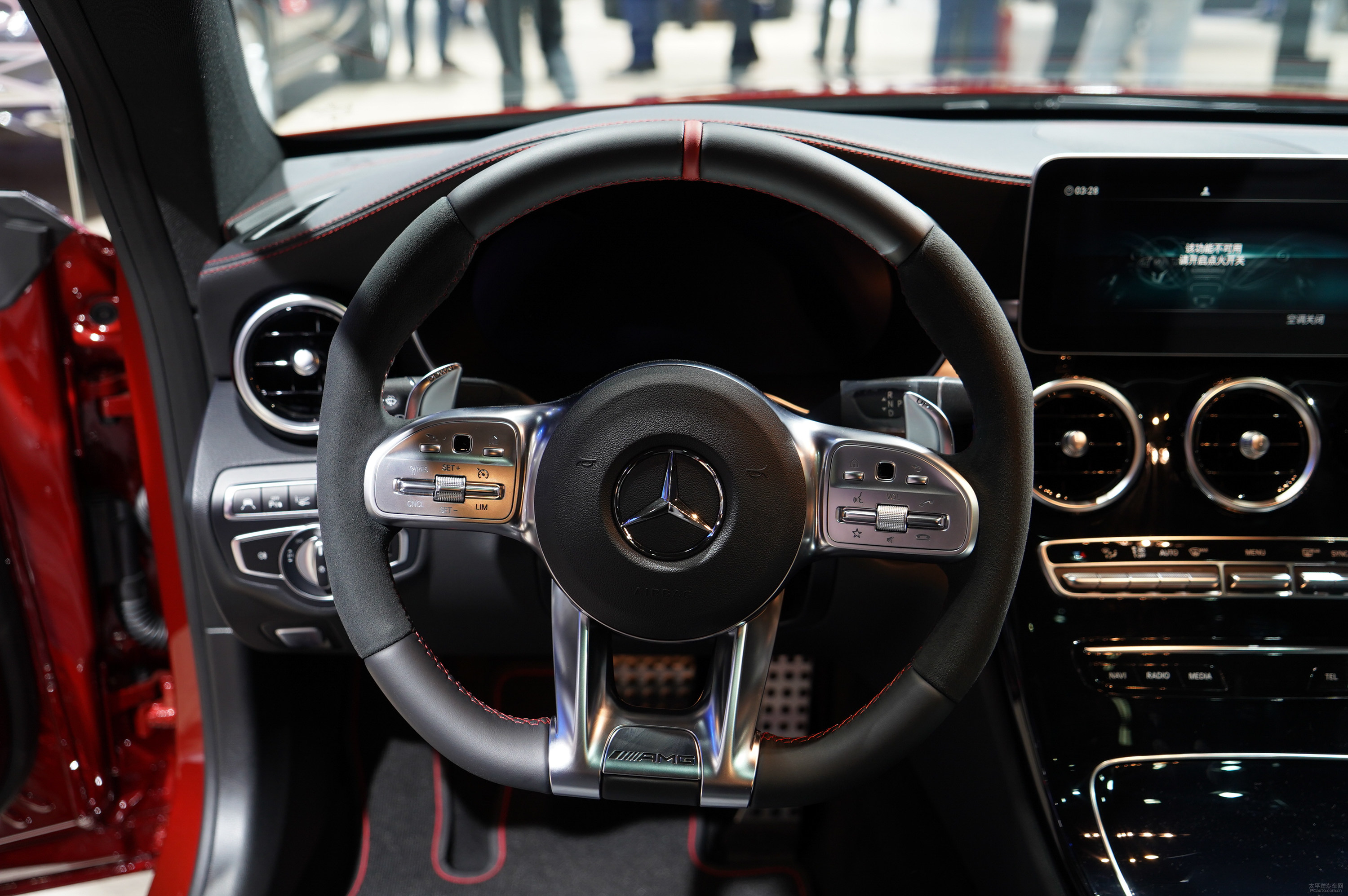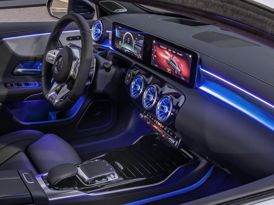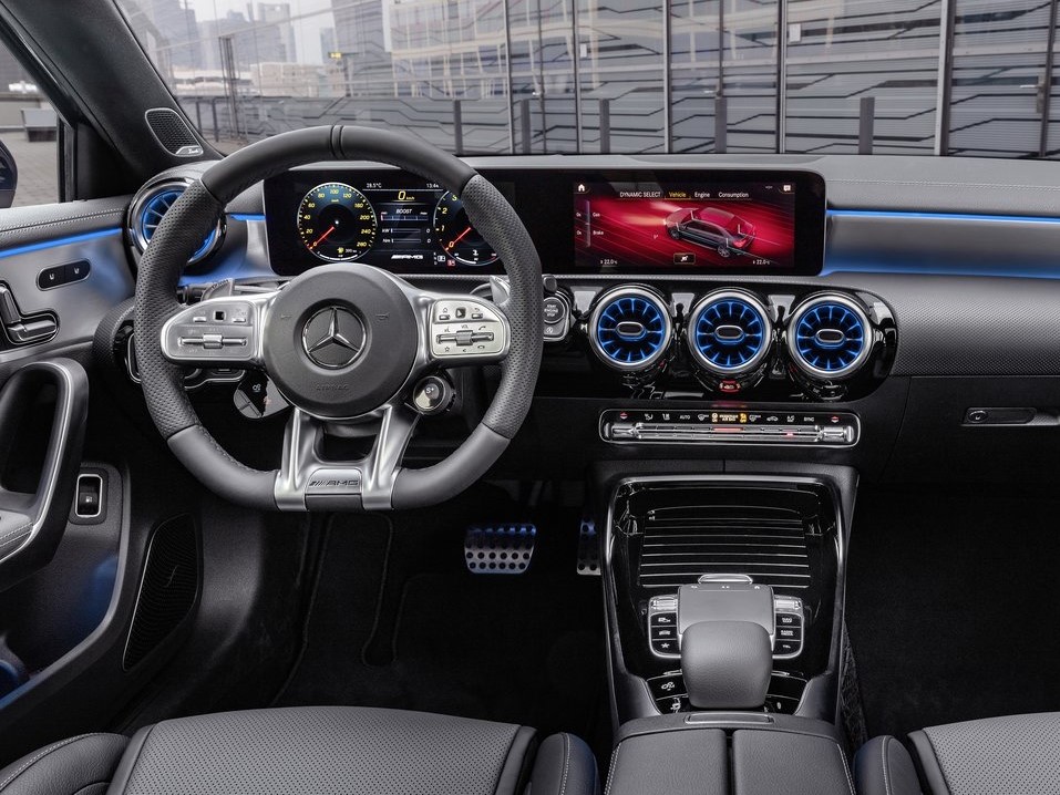 车内饰一部分,新汽车对比一般A级,其用材更为偏重健身运动,包含选用了厚底AMG汽车方向盘、灰黑色Artico皮革制品坐椅配搭淡黄色缝合线、铝合金油门踏板刹车板等。