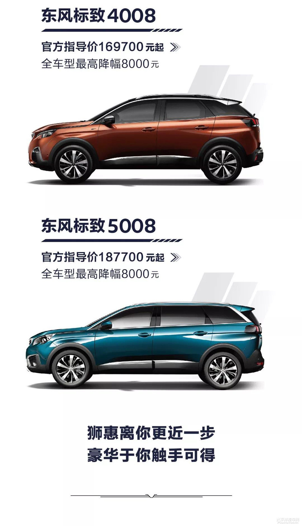 【尊流汽车网 新汽车频道栏目】前不久,为响应国家增值税改革现行政策,东风标致公布将于四月八号起下降一部分主销车系的官方网具体指导价钱,此外,还将发布金融业政策优惠“购车无忧三重奏”,在官方网参考价降低的另外,出示更大幅度的特惠。调价后,减幅最大的车系为漂亮4008和漂亮5008,2款车全车系最大减幅均做到8000元,次之是标致308,全车系最大减幅为5000元,敬请参照下面的图: