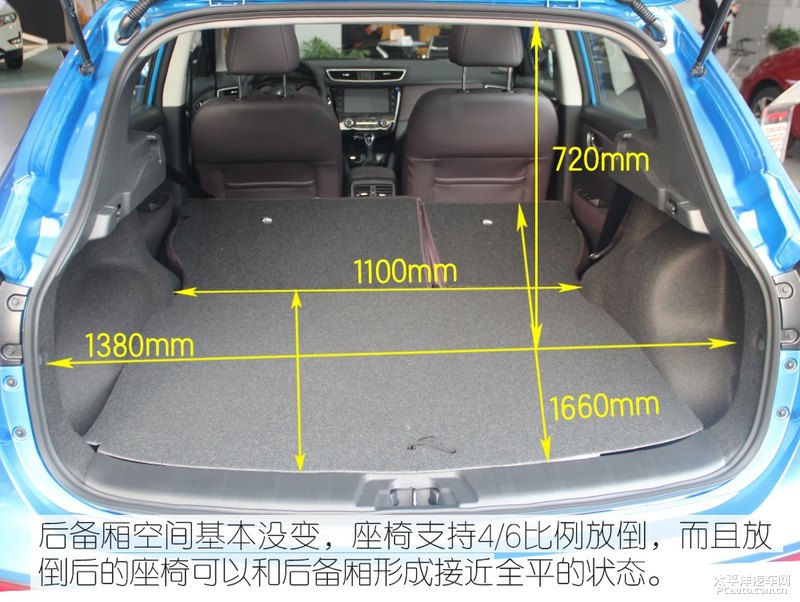 除此之外,新款逍客根据一系列的恰当设计方案,将后排座正中间旅客的腿部室内空间加長了73mm;然后尾箱室内空间也做到了486L。