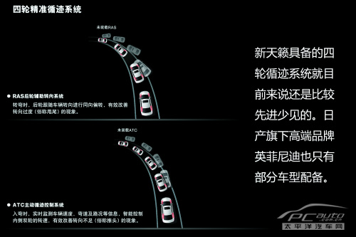 除此之外新世代天籁具有智能化汽车转向系统,简洁明了而言,便是在極限情况下,后胎会依据实时路况调整方位,以抑止转向过度或转向不足。此项技术性在曰产主打产品英菲尼迪(Infiniti)的一部分车系上现有武器装备,现如今出現在新世代天籁上最该其准买车人希望。