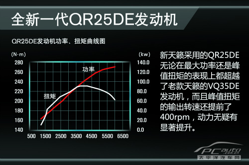 此次新世代天籁在驱动力上较大 的更改,毫无疑问是用新的QR25DE直列四缸柴油发动机替代了现阶段天籁上选用的VQ25 V型六缸发动机,排气量上两部型号都约为2.5L。将会许多人会觉得,六缸机“缩水率”成四缸机,这不是一种倒退么?先别着急着得出结论,柴油发动机也不是一定缸越大就就越好,何不先讨论一下新老天籁的驱动力比照: