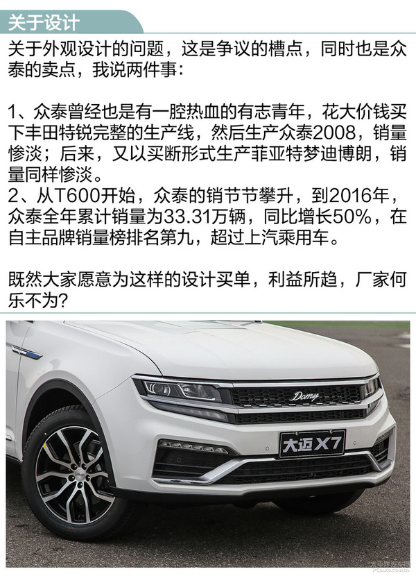发布中小型SUV这一不新奇,但一年以内要发布2款中小型SUV:SR9和大迈X7,实际上還是有点儿钦佩众泰的。两辆车轮距一致,宽度也高贴近,关联显而易见,但要防止市场竞争矛盾就得有一个精准定位差,进而各自进击不一样销售市场。SR9外观设计妖艳,踏入路;大迈X7精准定位稍低,走下边路,二者紧密联系,说白了多生小孩还打架斗殴,众泰这对策也有理有据。
