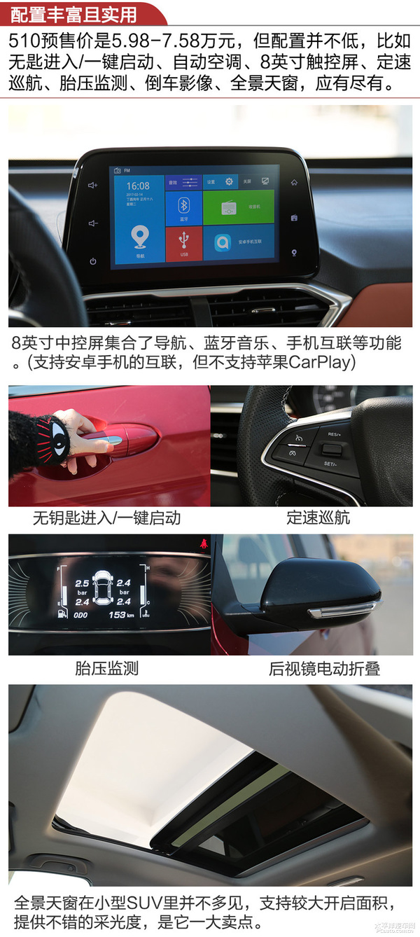 除此之外,侧边车体占比融洽,融进了升降式的车子顶部设计方案,线框顺畅,炫酷十足,而这种设计风格也很合乎时下年青人群的爱好。综上所述,在造型设计层面,本人觉得510做的是很取得成功的,针对年青受众群体的爱好把控及时。