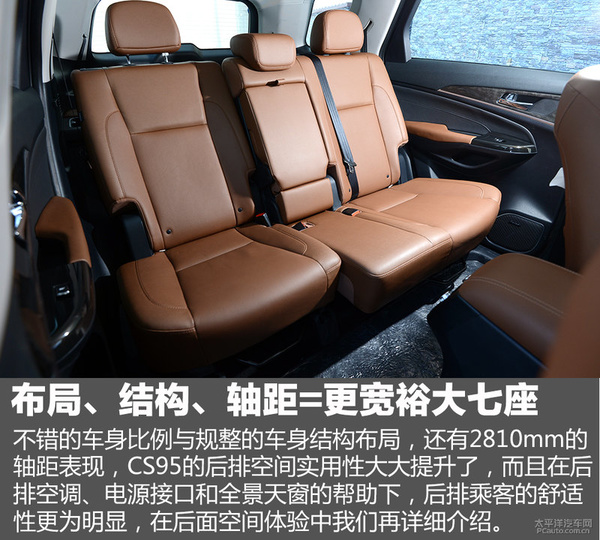 非常好的车体占比与整齐的车体构造合理布局,也有2811mm的轮距主要表现,CS95的后排座室内空间应用性大大的提高了,并且在后排座中央空调、电源和全景天窗车的协助下,后排座旅客的舒适度更加显著,在后面室内空间感受中人们再详解。