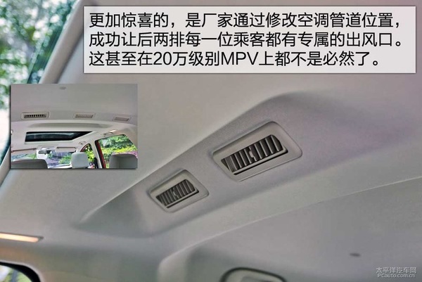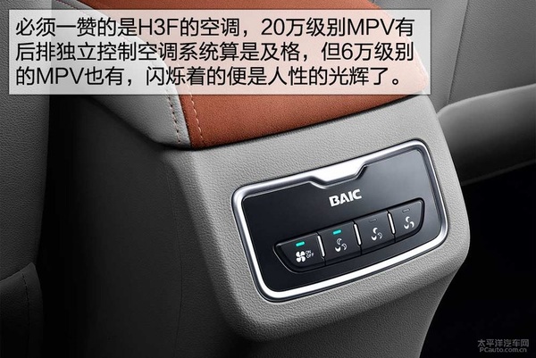 “个性化”三个字大约便是H3F与H3中间最大的不同吧,而提及个性化,务必一赞的便是它的中央空调:H3F不仅拥有后排座能够 独立操纵的空调机组,并且后排座通风口部位挪了挪以后,如今整车七个坐位常有相匹配的独立通风口了,此等“优待”,乃至在许多二十万级別的MPV上面并不是必定。