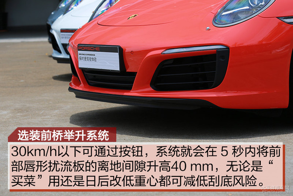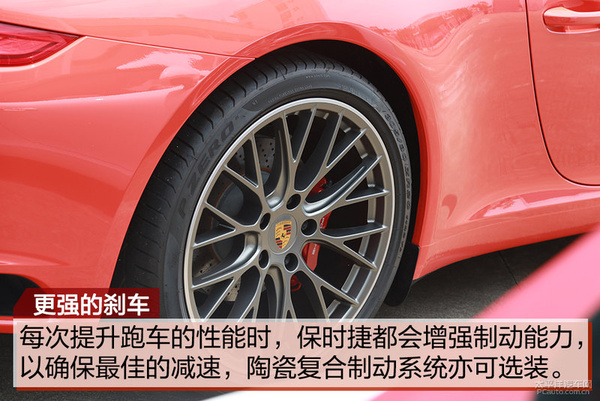911 Carrera的前胎刹车系统配置了增加的四活塞杆制动系统刹车盘,制动盘加厚型了6毫米(330 mm x 34 mm)。同 时,制动片面积提升了17%。911 Carrera S车系配置了来源于911 Turbo的制动片,比以往扩大了16%,配搭直徑提升22mm 的350mmx34 mm制动盘。他们根据开口销联接到全新升级的铝制制动系统斜角杆杠,进而缓解了非簧载品质。自然还出示了瓷器复合型刹车系统选配。