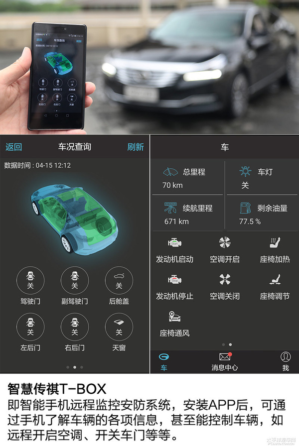 GA8上还配搭了称之为“智慧传祺T-BOX”的智能机实时监控安防监控系统,根据安裝APP后,可根据手机上掌握车子的各类信息内容,乃至能操纵车子,如远程控制打开中央空调、电源开关汽车车门这些。不容置疑,这将给平时出行产生了许多的便捷。