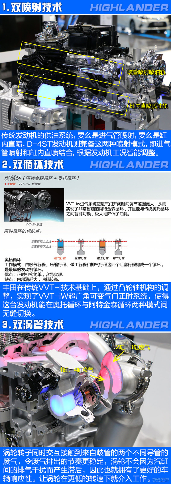 全新汉兰达配用的2.0T D-4ST柴油发动机,是丰田汽车全世界全新、最高效率的涡轮增压器柴油发动机。多种丰田汽车独创性的领先科技,另外出現在这里款2.0T D-4ST柴油发动机上,在其中最主要是“三双”技术性,包含“双循环”、“双喷涌”和“双涡管”系统软件。