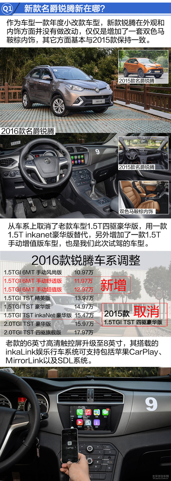 2016款名爵锐腾只是是做为一次本年度小换代车系,从外型车内饰上而言并沒有显著的转变,基本上与旧款2016年款车系保持一致。但从车型及其车系配备层面還是干了很大的调节。最先从车型上,取消了旧款车系1.5T四驱豪华型,用一款1.5T inkanet豪华型取代,此外提升了一款1.5T手动式超值版车系,也是人们本次试架的车系。