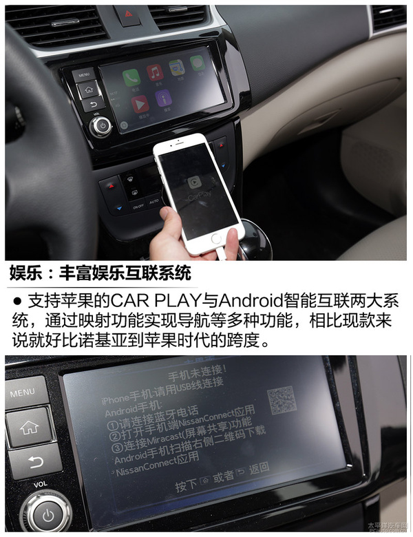 以前我提及了车里车载多媒体匮乏的难题在新轩逸上也获得了处理,你不用再去话几十块钱选购一根AUX电极连接线必备车里了,新添加了一块7英寸的五颜六色多媒体视频,显示屏的像素还行,实际操作顺畅,另外适用iPhone的CAR PLAY与Android智能互联系统两大系统软件,应用起來也并不繁杂。在这里套系统软件中虽然并沒有发觉导航功能,可是根据投射作用应用手机导航也很便捷,对比该款而言就如同Nokia到iPhone时期的跨距。