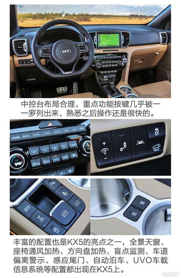 填满科技感的仪表台上功能键较多,重中之重作用基本上被一一列举出去。高配车系丰富多彩的配备也是KX5的闪光点之一,全景天窗车、座椅通风加温、方向盘加热、盲区检测、行车道偏移警告、磁感应电动尾门、自动泊车、UVO车截信息管理系统等丰富多彩配备都出現在KX5上。