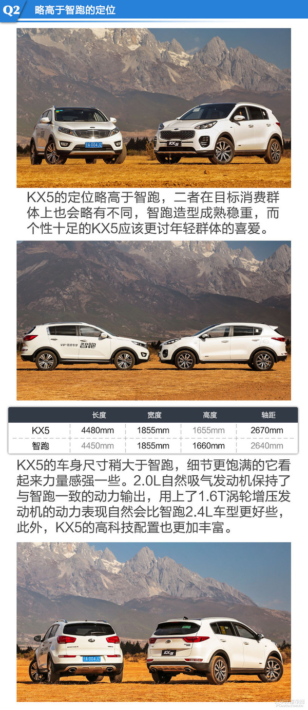 做为KX5的老前辈,智跑仅有的2.0L和2.4L车系,在排量小涡轮增压器的市场前景下看起来一些竞争能力不够。KX5有着比智跑更大的车体规格,2.0L自吸柴油发动机维持了与老前辈一致的驱动力輸出,而增加的更为效率高的1.6T车系最大马力做到了177PS,最大扭矩转速也比2.4L的老前辈提高了39Nm,做到265Nm,除此之外,KX5的新科技配备会更为丰富多彩。
