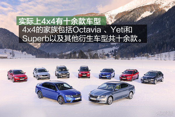 斯柯达现阶段发布的4×4车系事实上早已高达十种,在其中包含明锐系列产品的Octavia 4×4、Octavia Combi 4×4、Octavia vRS 4×4、 Octavia Combi RS 4×4及其Octavia Scout,SUV系列产品的Yeti 4×4、Yeti Outdoor 4×4及其Yeti 蒙特卡洛版4×4,及其斯柯达的旗舰级车系Superb速派4×4及其Superb Combi 4×4。