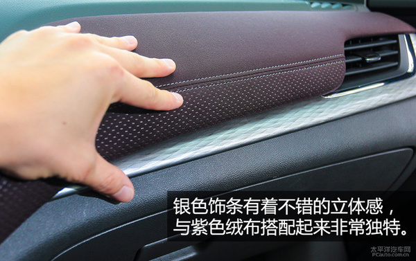 环境保护式的车内饰设计方案能给人充足的归属感,仪表台选用“曼陀罗紫”丝绒布遮盖,产生了全新升级的视觉冲击,也更具有感染力。