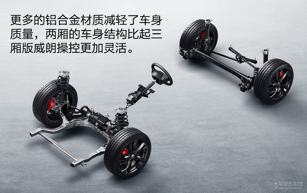 前后左右防撞钢梁、副车架等位置均选用量重量轻,抗压强度高些的铝合金型材材料。对比上一代同级別车系,总体完成了超出100公斤的“减负增效”,动态性回应更为冷峻。