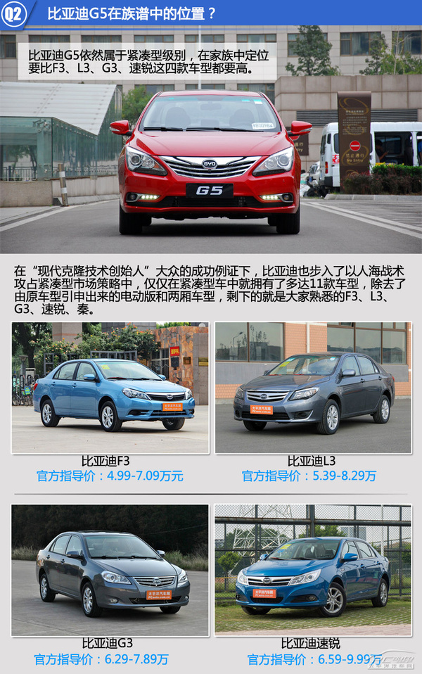 在同一级別发布几款车系,而且这几种车系中间的机械系统转变并不大乃至是来源于同一服务平台,这种全是生产厂家以便攻占大量的销售市场而选用的营销策略罢了,byd在这些方面也早已十分熟练了,而此次发布的G5以便不与主打产品的别的车系导致立即市场竞争,在精准定位上应比F3、L3、G3和速锐要高。