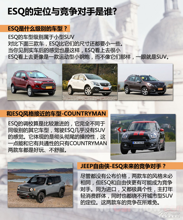 中国销售市场上的中小型SUV十分多,国内的北京长安CS35、合资企业的昂科拉、创酷、2008、翼博,進口的COUNTRYMAN、自由侠等,每个级别的车系均有。ESQ做为整车进口,也是豪华车品牌的车系,竞争者应该是COUNTRYMAN和自由侠。