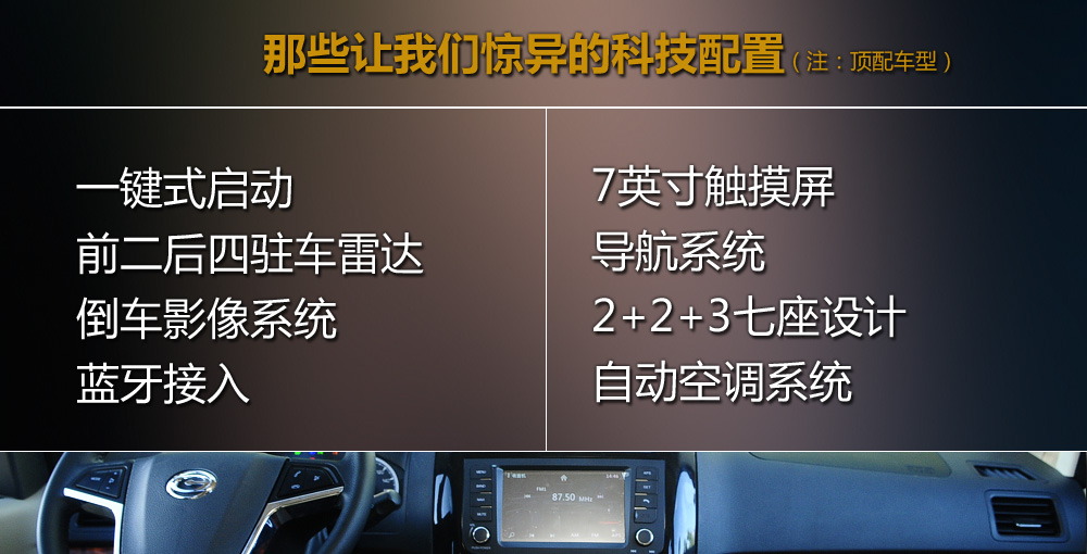 【尊流汽车网 测评频道栏目】 一键式起动、前后左右六点雷达探测 倒车后视系统软件、恒温空调、蓝牙手机连接、网站导航、七坐设计方案,你大约认为我说的是一款上百万级的全规格SUV车系吧。但是令人惊讶的是它是一款中小型MPV,它的价钱只购买十台Iphone 5S,还不可以是土豪金的。